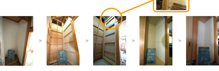 冷蔵庫の裏側、引戸の上の壁。建物の横揺れを防ぐ、部屋との間仕切り壁など、コストや工期の問題をクリア―していきます。