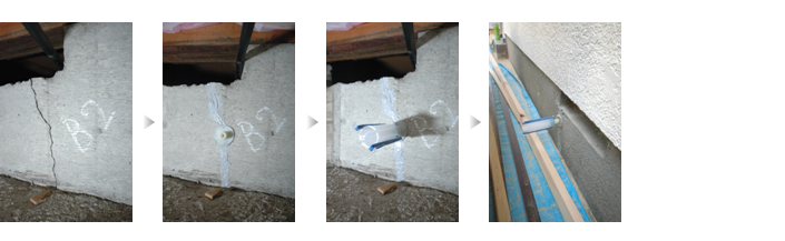 基礎補強工事です。クラックの入っている部分に樹脂製の薬品を注入していきます。